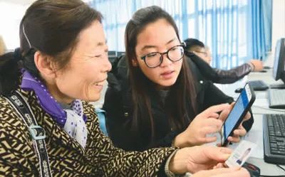 江蘇省鎮(zhèn)江市潤州區(qū)七里甸社區(qū)聯(lián)合江蘇科技大學(xué)成立老年網(wǎng)校,幫助老人們快樂上網(wǎng),豐富文化生活。下圖為志愿者向老年居民傳授智能手機上網(wǎng)購票技能。
