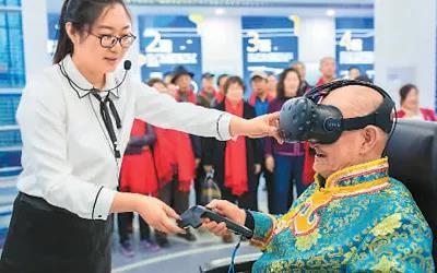 重陽節(jié)前后,內(nèi)蒙古呼和浩特市玉泉區(qū)邀請轄區(qū)老年人走進該區(qū)新投入運營的大數(shù)據(jù)應(yīng)用產(chǎn)業(yè)基地,近距離感受新科技帶來的生活和工作方式的變化。下圖為一位老人在體驗VR眼鏡。