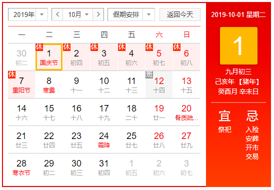 2019年10月1日至10月7日放假,共7天。其中,10月5日(星期六)、10月6日(星期日)、10月7日(星期一)為國(guó)慶節(jié)法定節(jié)假日