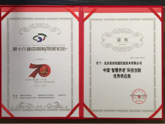 第十六屆的論壇主題為“慶祝新中國(guó)70周年華誕,致敬科技工作者,弘揚(yáng)科學(xué)家精神,推進(jìn)科技創(chuàng)新引領(lǐng)產(chǎn)業(yè)發(fā)展,實(shí)現(xiàn)新時(shí)代高質(zhì)量發(fā)展”。杰佳通完美的契合了其對(duì)于高科技企業(yè)的發(fā)展,并且能夠助力時(shí)代發(fā)展,在引領(lǐng)智慧養(yǎng)老方面發(fā)揮了不可替代的作用。第十六屆中國(guó)科學(xué)家論壇授予公司領(lǐng)導(dǎo)人張其魯為中國(guó)“智慧養(yǎng)老”科技創(chuàng)新先鋒人物、北京思杰佳通信息技術(shù)有限公司為中國(guó)“智慧養(yǎng)老”科技創(chuàng)新優(yōu)秀供應(yīng)商。