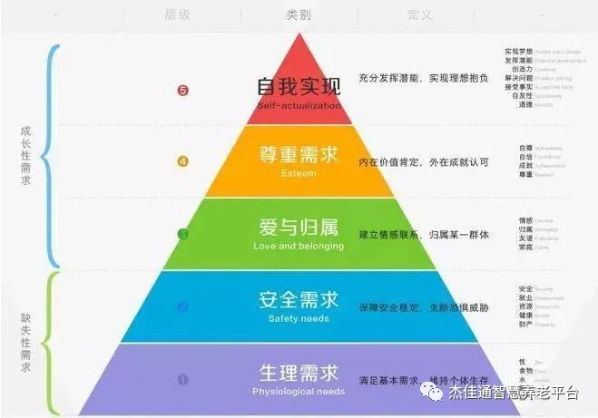 健康老人和失能老人的需求其實有很大差異,主人公的需求包括健康監控報警、送餐服務、保潔服務、社交需求、陪伴需求等等,而老王的需求主要是護理需求。這些需求按照馬斯洛分層理論可以分為生理、安全、情感、尊重和自我實現,其中生理和安全需求為缺失性需求,情感、尊重和自我實現為成長性需求。