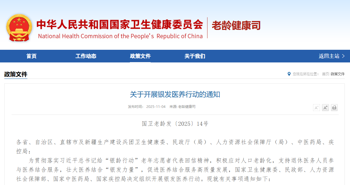 為貫徹習(xí)近平總書記給“銀齡行動”老年志愿者代表回信精神,積極應(yīng)對人口老齡化,國家衛(wèi)生健康委、民政部、人力資源社會保障部、國家中醫(yī)藥局、國家疾控局聯(lián)合印發(fā)通知,決定組織開展“銀發(fā)醫(yī)養(yǎng)行動”,支持退休醫(yī)務(wù)人員參與醫(yī)養(yǎng)結(jié)合服務(wù),壯大醫(yī)養(yǎng)結(jié)合“銀發(fā)力量”。