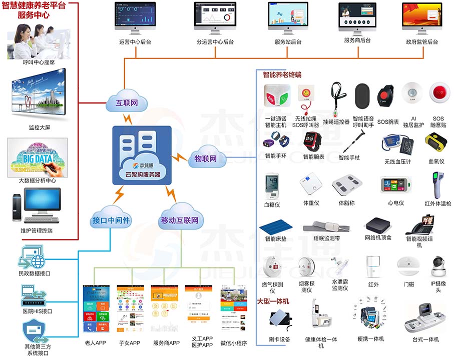 1)杰佳通智慧養(yǎng)老平臺(J3-HBCSP)具有六十多項大功能模塊,幾百多項小的功能模塊。