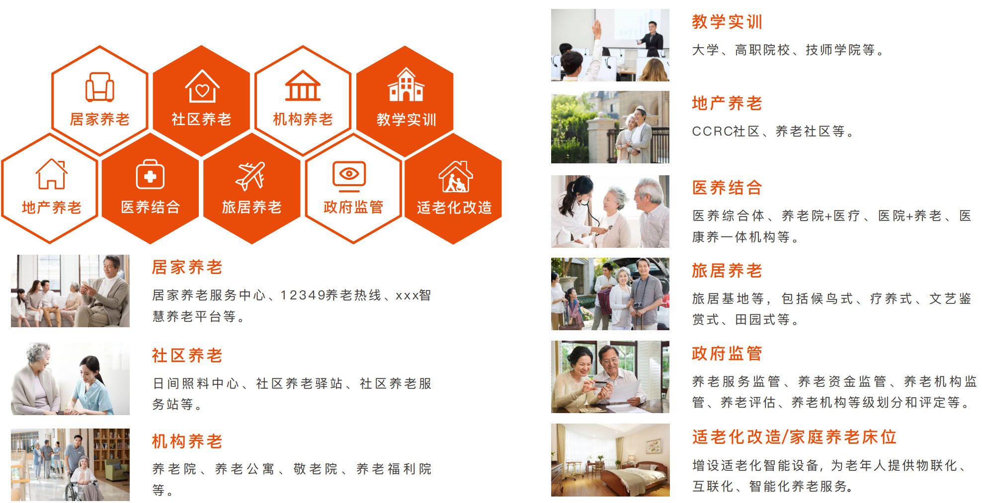 醫(yī)養(yǎng)結(jié)合:醫(yī)養(yǎng)綜合體、養(yǎng)老院+醫(yī)療、醫(yī)院+養(yǎng)老、醫(yī)康養(yǎng)一體機構(gòu)等;