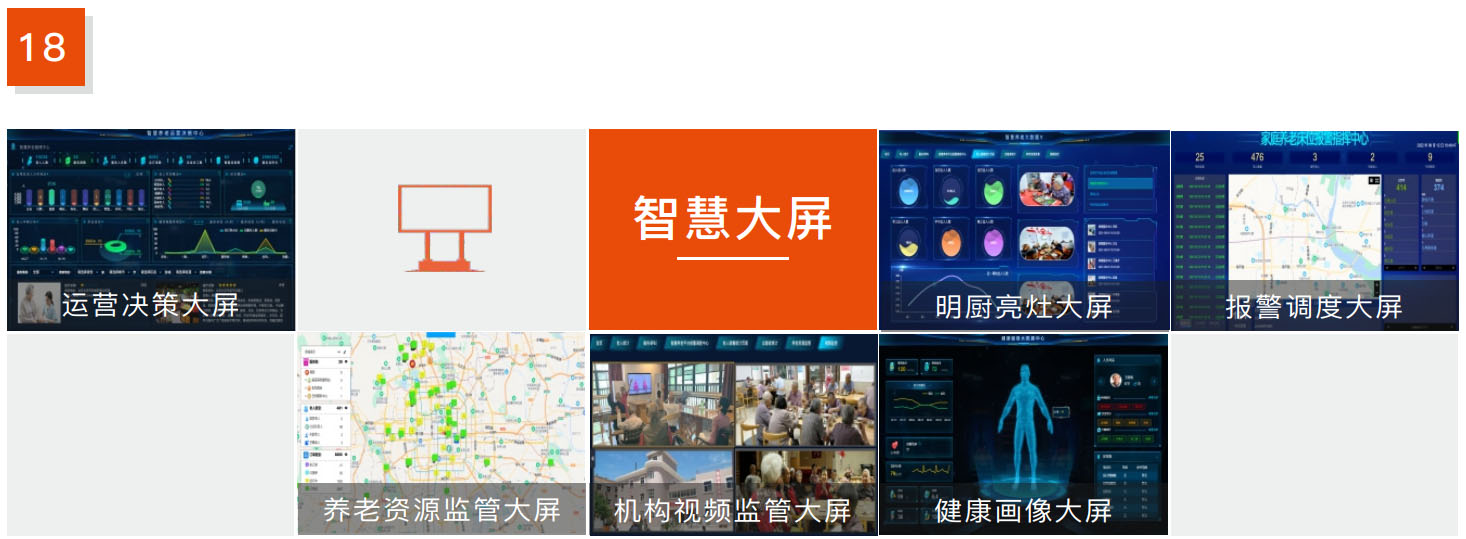 居家養(yǎng)老運營決策大屏、機構(gòu)養(yǎng)老運營決策大屏、健康畫像大屏、呼叫中心大屏、明廚亮灶大屏、大數(shù)據(jù)綜合大屏、自定義綜合大屏、志愿者大屏、養(yǎng)老資源監(jiān)管大屏、報警調(diào)度中心大屏、老人數(shù)據(jù)分析大屏、機構(gòu)視頻監(jiān)管大屏、健康巡診可視化大屏。