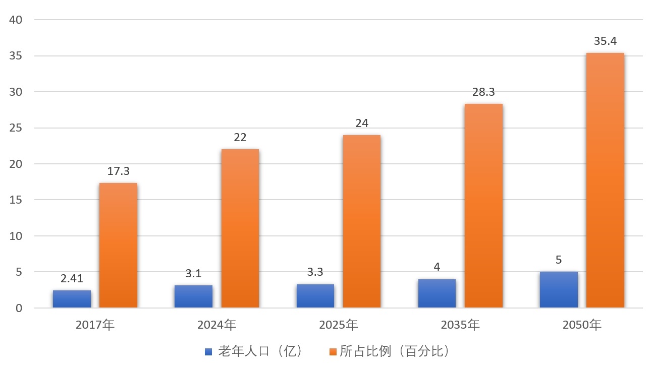 我國確立了“以居家為基礎(chǔ)、社區(qū)為依托、機構(gòu)為支撐”的養(yǎng)老產(chǎn)業(yè)框架和養(yǎng)老格局,在家中養(yǎng)老(居家養(yǎng)老),7%在社區(qū)養(yǎng)老,3%在機構(gòu)中養(yǎng)老;2025年1月17日,國家統(tǒng)計局發(fā)布,截至2024年底,我國60歲及以上老年人口有3.1億人,占總?cè)丝?2%,其中,65歲及以上人口超2.2億人,占15.6%。2035年左右我國60歲及以上老年人口將突破4億,在2050年前后達到頂峰,約占總?cè)丝诘?/3。那時,中國將有4.8億、甚至接近5億老年人,是世界上老年人口最多的國家。
